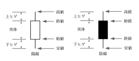 ローソク足は、この実体と上下のヒゲによって、その日の始値、安値、高値、終値を表しています。そして、ローソク足には図のように「実体」の箱形の部分が白いものと黒いものがあります。